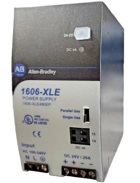 The Allen-Bradley 1606-XLE480EP is an essential switched mode Power supply. It is a stand-alone, 1-phase power supply that is designed for DIN rail and back panel mounting. This module has an input voltage of 100-240 VAC. It delivers an output voltage of 24-28 VDC, output current of 20 Amperes, and output power of 480 Watts. This power supply has a hold-up time of 54-65 ms.