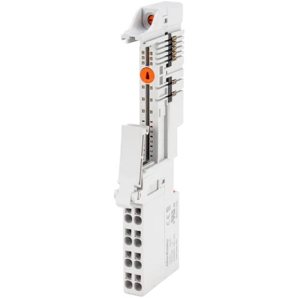 The 1734-TOP POINT I/O Terminal Base by Allen Bradley is a one-piece base, meaning that its purpose is as a mounting base with an integrated 8-terminal screw-clamp block. It has a wide range of applications in industrial automation because it provides wiring of digital input/output/relay modules, analog input/output modules, and specialty modules. This POINT I/O terminal base can be mounted directly on the DIN-rail, either horizontally or vertically, and will connect distribution of field power-bus as well as backplane communication. The mechanical keying of the terminal base prevents incorrect module placement. While the POINT I/O system implements a No-Tools design, providing a smooth assembly process to set up the I/O module with the terminal base, without using any tools.