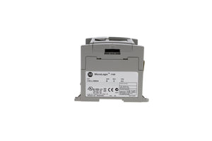 The 1763-L16BWA MicroLogix 1100 Programmable Controller by Allen-Bradley is an industrial programmable controller with a total of Eighteen (18) I/O points. It consists of Ten (10) 24VDC sinking or sourcing digital inputs, Two (2) Analog Inputs and Six (6) relay outputs. This controller requires an input power supply of 100-240VAC.