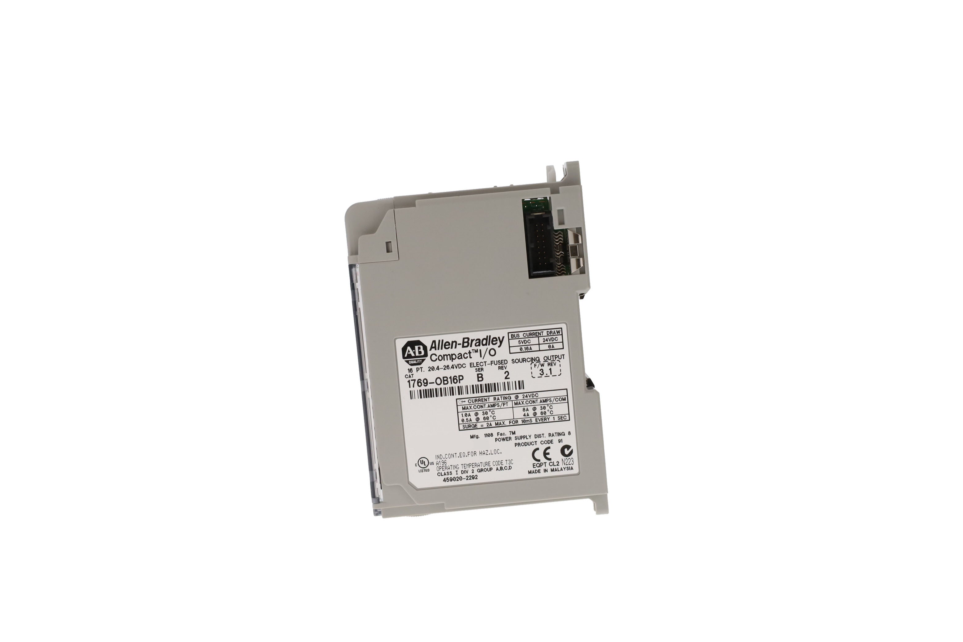 The Allen-Bradley 1769-OB16P is a 1769 Compact I/O Solid-state 24VDC output module. This module features Sixteen (16) protected output channels in a single group. It delivers 20.4-26.4VDC output voltage range. This module is compatible for use with the CompactLogix and MicroLogix 1500 controllers.