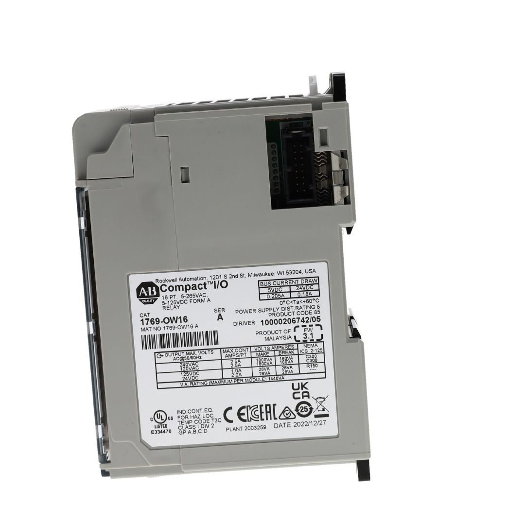 The 1769-OW16 is Compact I/O expansion module. This module has Sixteen (16) Relay output channels. This module is designed for an operating voltage range of 5 - 265VAC and 5 - 125V DC. module is compatible for use with MicroLogix 1500 and CompactLogix controllers.