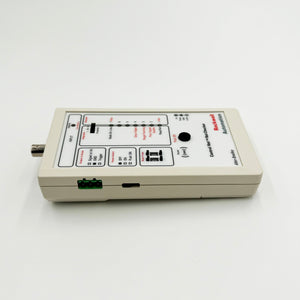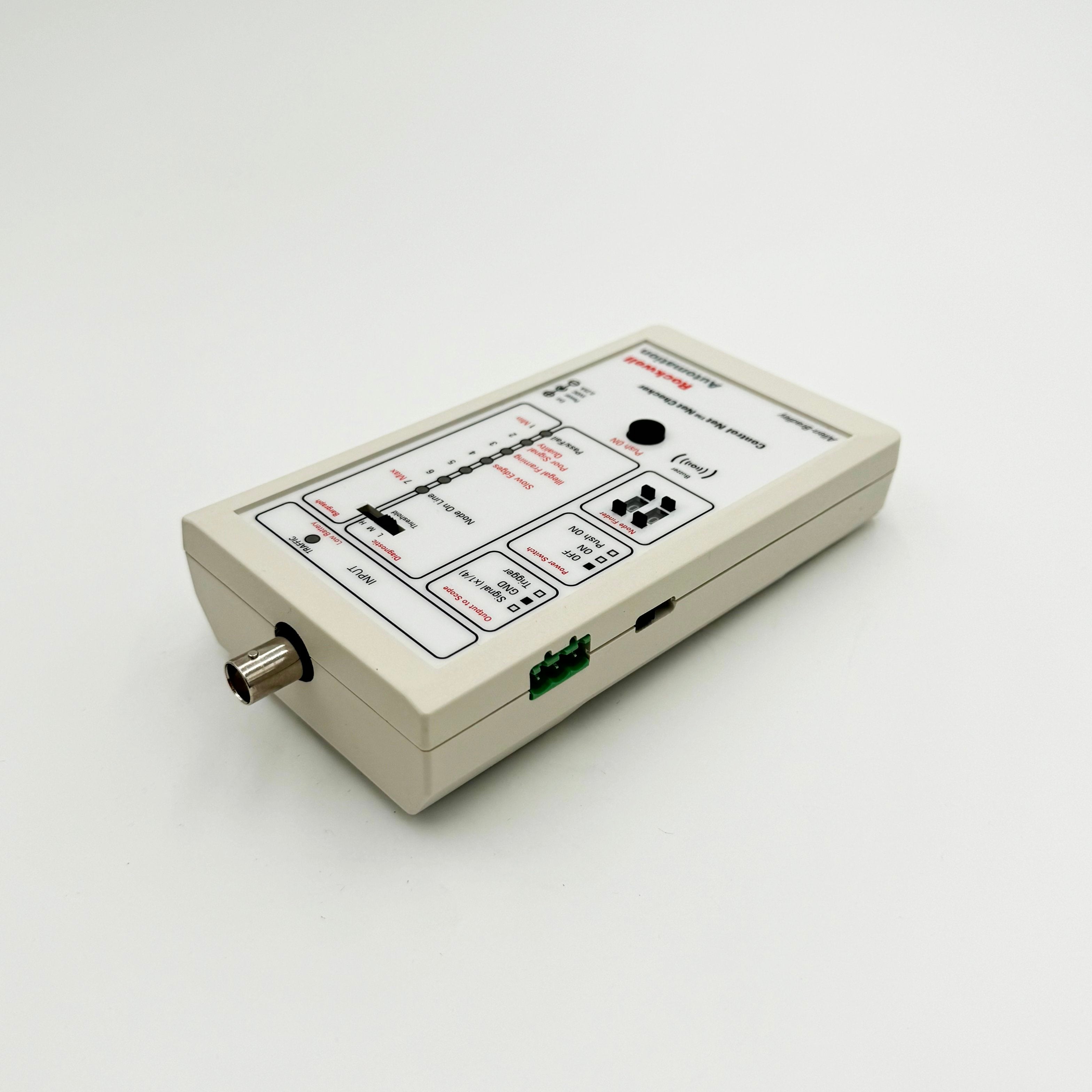 This is a hand-held field device powered by batteries (2x1.5V AA). The 1788-CNCHKR NetChecker is designed to help in the troubleshooting and commissioning stages of industrial automation networks that are based on the ControlNet protocol. It is used to validate signal quality on the ControlNet cabling. Note that the device does not read and give conclusions on the content of communication messages, it only evaluates the signal quality through the coaxial cables. Although it does not check message content, it is systematic with signal inspection because it checks signal reflections and noise, rising and falling edge quality and timing, distortion level, Manchester signal encoding violations, minimum message intervals, peak-to-peak amplitude, and the minimum time between messages. If any faults on the network are detected, a piezo buzzer will give an audio indication.
