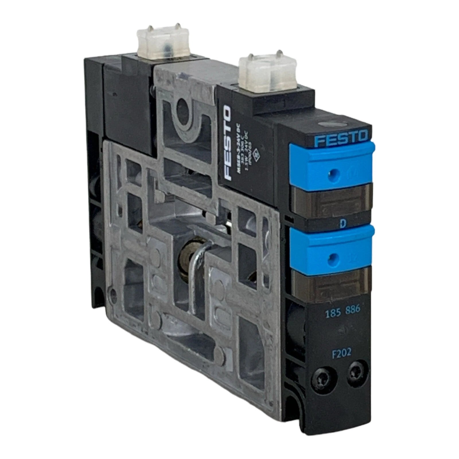 The 185886 is a compact dual 2/2-way electrical solenoid valve designed for use in Festo CPV valve terminals. With an 18 mm valve size and 1600 l/min nominal flow rate, it provides reliable monostable control with non-reversible flow and fast switching performance. The unit operates at 24 VDC and supports pressures from –0.9 to 10 bar, making it ideal for precise pneumatic actuation in industrial systems.