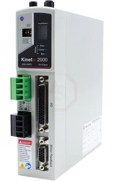 The Allen-Bradley 2093-AMP5 is a Kinetix 2000 Multi-axis Servo Drive Axis Module (AM) with a power rating of 0.9 kW. Designed for use in multi-axis servo drive systems, this module operates with a 230V DC Bus Power Inverter and mounts on a Kinetix 2000 Power Rail. It features a 3A inverter and must be utilized alongside an Integrated Axis Module (IAM).
