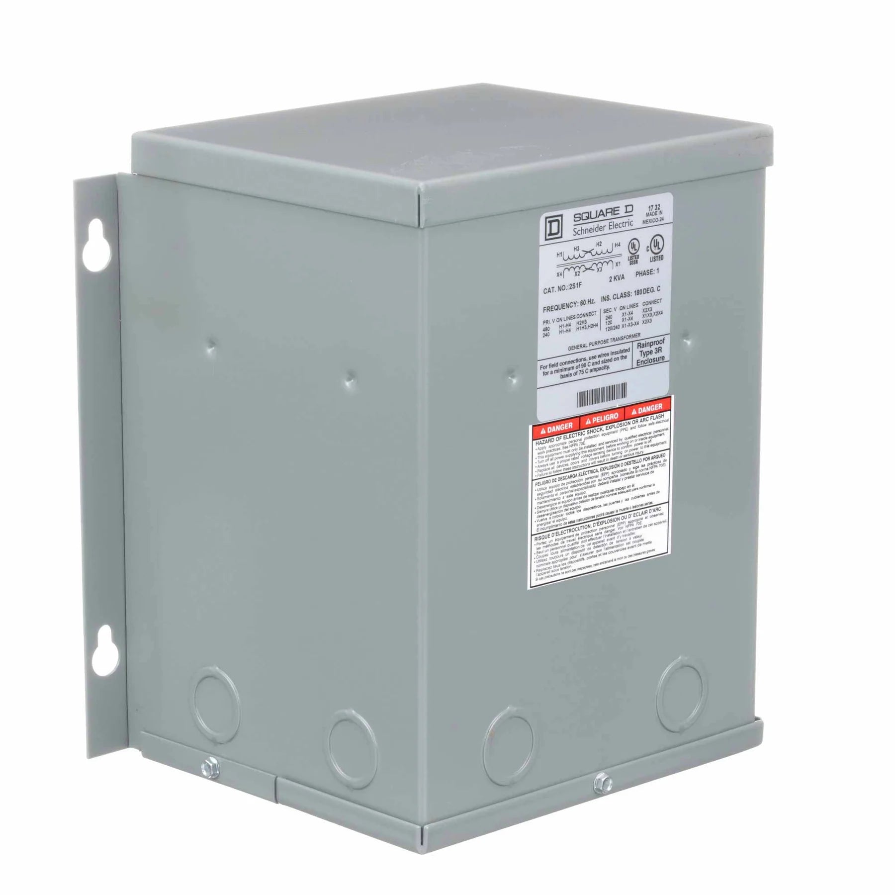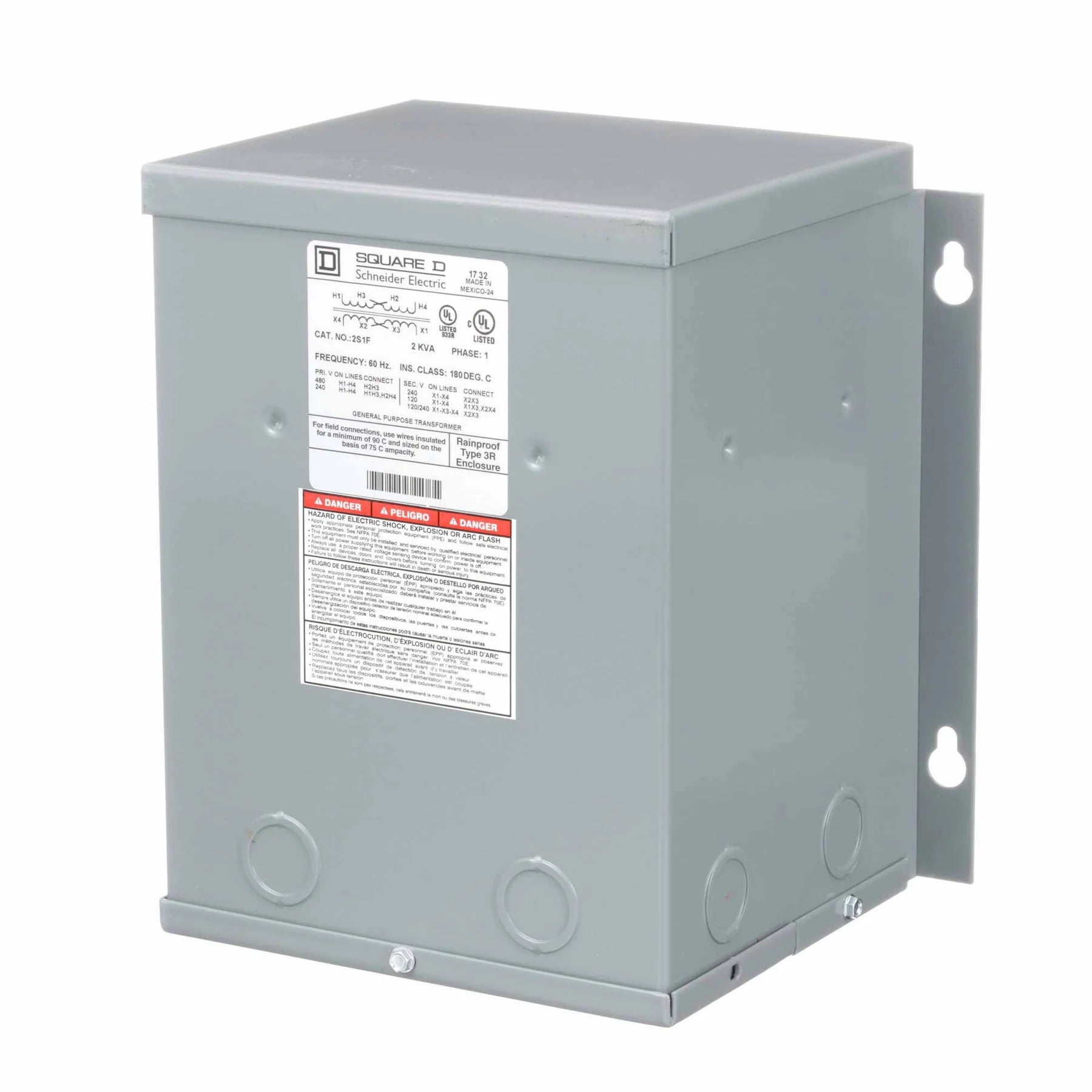 The 2S1F by Square D is a dry type transformer designed for efficient energy conversion and distribution. This transformer has a power rating of 2 kVA, making it suitable for various light industrial, commercial, and residential applications. It features a primary voltage of 240X480V and a secondary voltage of 120/240V, supporting a single-phase electrical system.
