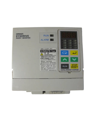The Omron 3G3EV-AB007M-CE is a compact, general-purpose inverter drive from the SYSDRIVE 3G3EV series, designed for precise and economical motor control in light industrial applications. With a power rating of 0.75 kW (1 HP), it operates on a single-phase 200–240 VAC input and provides a three-phase 0–240 VAC output with a maximum output current of 5 A.
