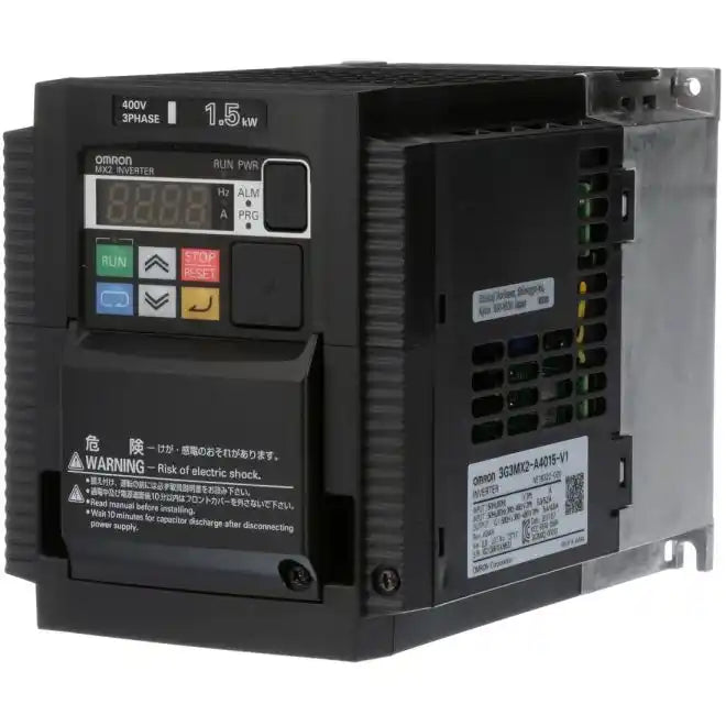 The Omron 3G3MX2-A4015-V1 is a compact, high-performance inverter drive from the MX2 series, developed for advanced motor control in industrial automation systems. With a power rating of 1.5 kW (2 HP), it operates on a three-phase 380–480 VAC input and delivers a three-phase 0–400 VAC output. It supports both induction and permanent magnet motors and offers high starting torque and smooth speed control, making it ideal for demanding applications.