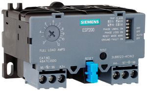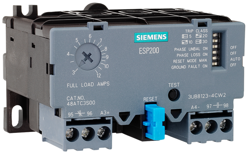 The 3UB81234EW2 is part of the ESP200 Series of solid-state overload relays by Siemens, engineered for 3-phase motor protection applications. It features a current range of 10–40 A, offering flexibility for various motor sizes and load conditions. This unit belongs to Size A1, designed to be either directly mounted onto contactors or used as a stand-alone device. The relay provides class 5 to 30 selectable protection, ensuring appropriate response times based on motor characteristics.