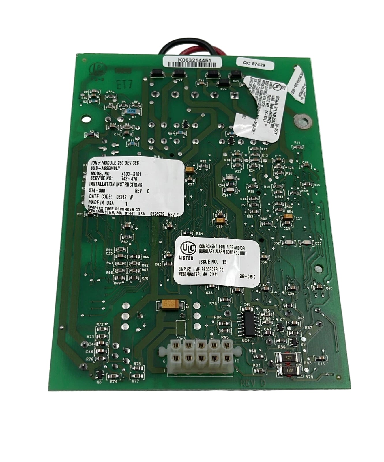 The 4100-3101 is part of the Simplex 4100U and 4100ES system platform, serving as the IDNet channel interface that connects detectors, modules, and manual stations on the addressable loop. The module installs directly into the panel’s power distribution interface and communicates with field devices via IDNet signaling. With a communication range of up to 10,000 feet, it ensures stable data transmission across extensive installations. The 4100-3101 is designed for industrial-grade reliability and is UL Listed for fire alarm applications. Though discontinued, it remains a critical component for maintaining existing 4100-series systems, with the 4100-3102 serving as its functional replacement.