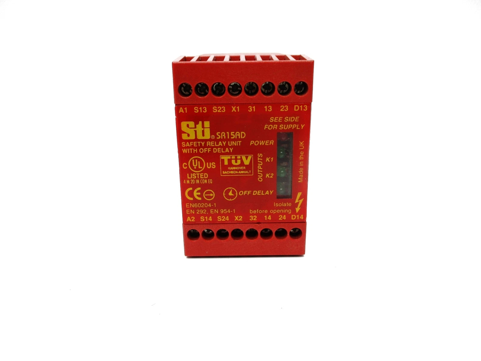- This safety relay unit offers precise safety control with time-delayed shutdown features: