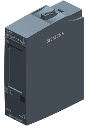 SIMATIC ET 200SP, Relay module, RQ NO 4x 120V DC..230VAC/5A ST. 4 normally open contacts, isolated contacts, packing unit: 1 piece, fits to BU-type B0 and B1, Colour Code CC40, substitute value output, module diagnostics for: supply voltage With SIMATIC ET 200SP, Siemens offers a multifunctional and distributed I/O system, which can be commissioned very simply due to its space-saving design. It is approved for degree of protection IP20 and for installation in a compact control box. The system ensures maximum flexibility because you can quickly and simply replace modules at any time due to the multi hot swapping feature. SIMATIC ET 200SP also offers a wide range of different and fast communication methods. With the integrated MultiFieldbus interface module IM155-6MF, you can use the optimum protocol for your application flexibly at any time because this function supports multiple Ethernet protocols. Installation and service are simplified by a standardized identification system based on equipment labeling plates and color-coded connector assignments. Siemens guarantees a future-proof investment due to integration of innovative and long-life automation products. After all, as industry experts, they are already using tomorrow's technologies and thus redefining market standards. Consistent data availability, flexible use cases, and versatile integration options ensure optimum performance of ET 200 products. The scalable, cost-optimized configuration of an ET 200SP station is ensured by the wide range of signal modules. In addition to digital and analog input and output modules, respective fail-safe variants are also available for applications up to SIL 3 / PLe. This also applies to the integrated motor starters, which are suitable for motors up to 5.5 kW. Energy Meters for measuring and analyzing the energy consumption, IO-Link master (V1.1.), and many other communication and technology modules allow the system to be adapted to any automation task. The accessories available for the ET 200SP range from color-coding plates and equipment labeling plates to labeling strips for the individual modules and thus ensure maximum manageability in the control cabinet.