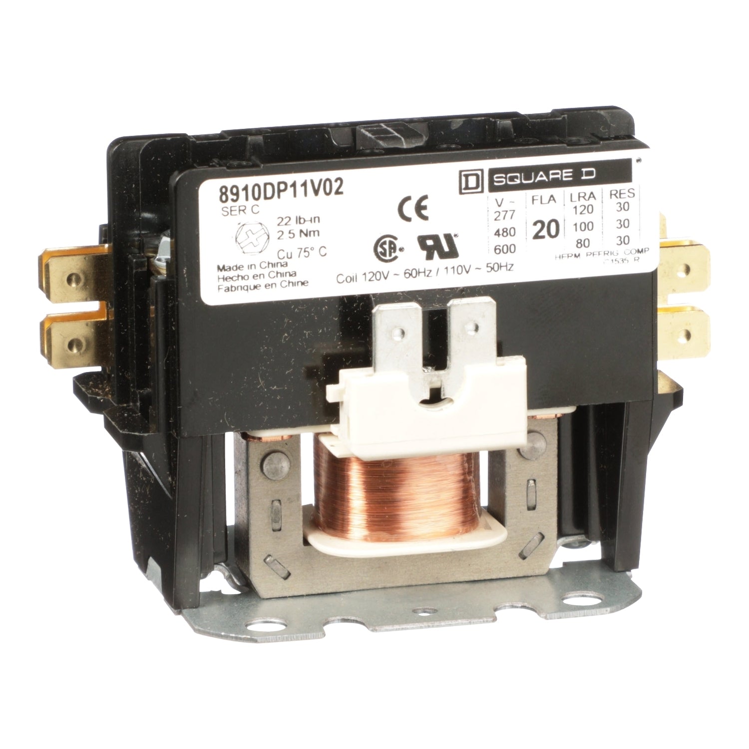The 8910DP11V02 is a definite purpose contactor with specifications including a 20A current rating, 1 pole configuration, and a coil operating at 110/120VAC 50/60Hz. Designed by Schneider Electric, the 8910DP definite purpose magnetic contactors are primarily intended for use in heating, air conditioning, and refrigeration applications.