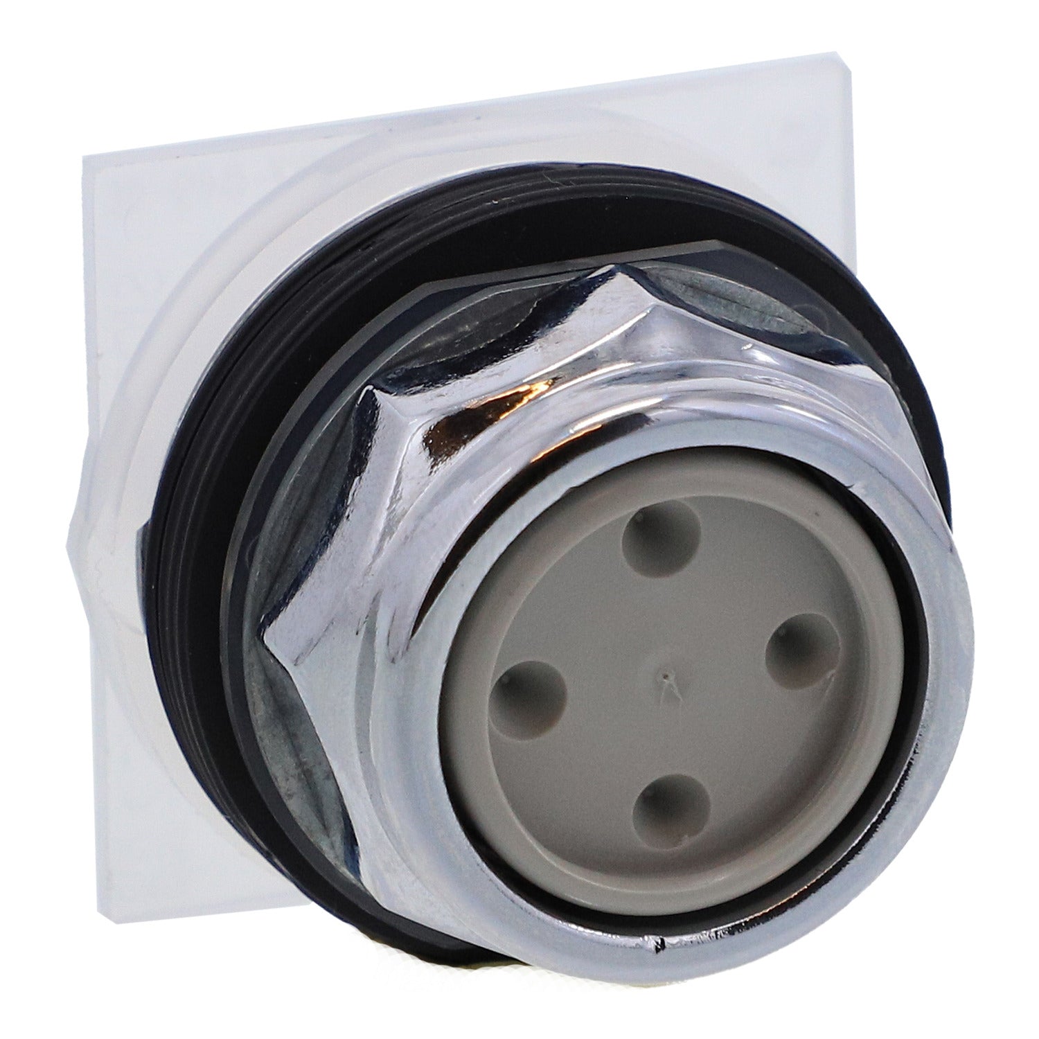 The 9001KR1U is a 30mm push button designed for heavy-duty industrial applications and extreme environments. The push button is part of a robust range known for long-term reliability. The 9001K operators feature a metal operator base, whereas the 9001SK operators have a plastic base. This extensive line includes various push button types, such as standard push buttons, emergency stop mushroom head push buttons, selector switches, key-operated switches, and operators with potentiometers. Additionally, the line comprises pilot lights (LED, incandescent, and neon), joystick controllers, wobble stick operators, and operators with multiple functions. These operators can be purchased either as complete units or as subassemblies for user-specific assembly.