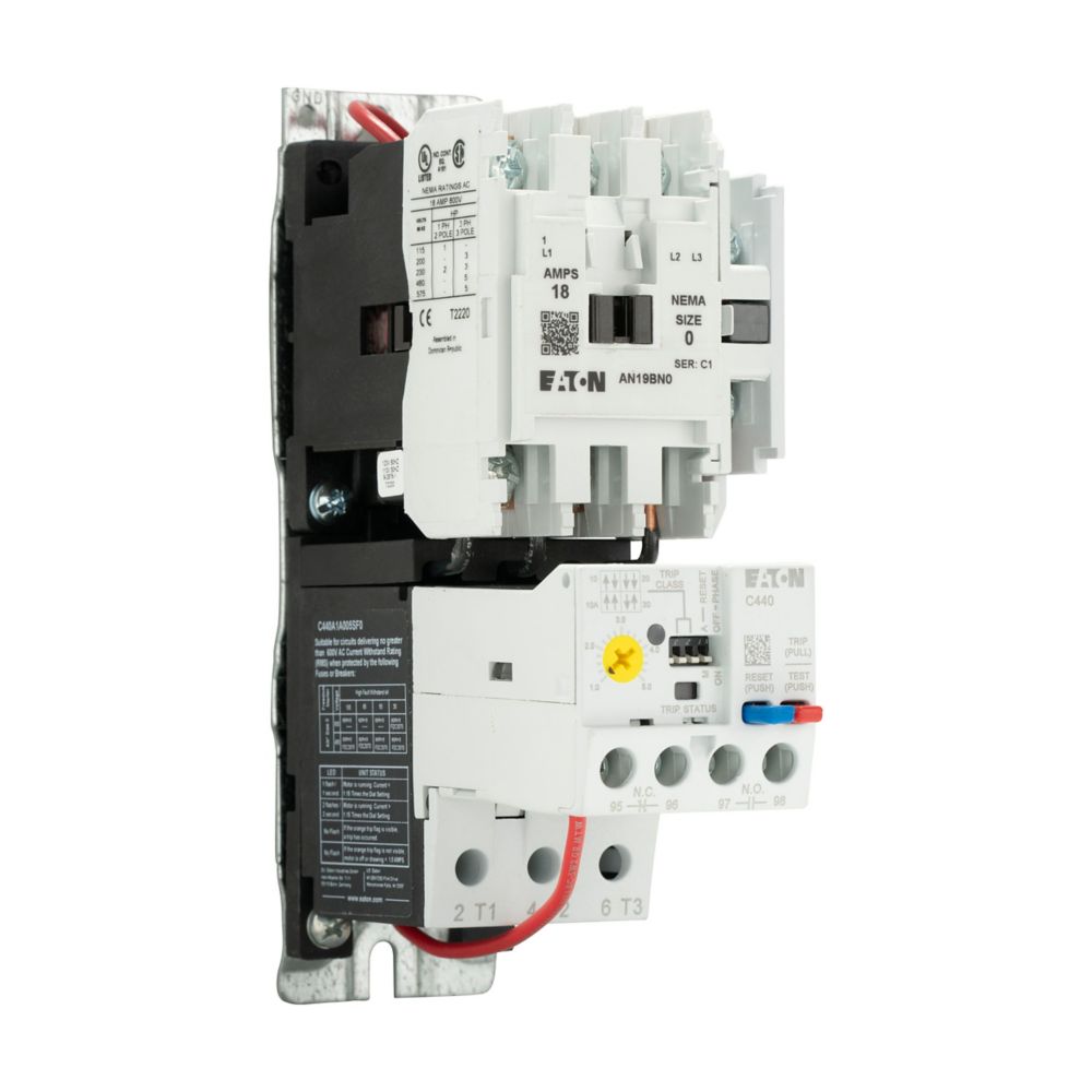 The Eaton Freedom NEMA Motor Control Starter, part number AN19BN0A5E020, is a full voltage non-reversing starter designed for use in various industrial applications. This motor control starter is part of the Eaton Cutler-Hammer Freedom Series and features a NEMA Size 0 open enclosure. The device is equipped with a C440 electronic overload relay, providing advanced protection and control capabilities.