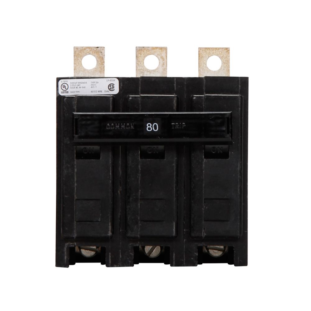 Eaton / Cutler-Hammer Bolt-On Circuit Breaker Its Compact And Easy to Install three poles thermal-magnetic circuit breaker has a current rating of 80 amps at 40 deg c and voltage rating of 240 Vac it has an interrupt current rating of 10 kilo-amps it accommodates aluminum/copper wire of size 8 to 1/0 AWG at load it has extended tang line terminal and box lug load terminal for convenient connection it has bolt-on type connection it is suitable for industrial applications circuit breaker is Ul 489 listed and Csa certified.