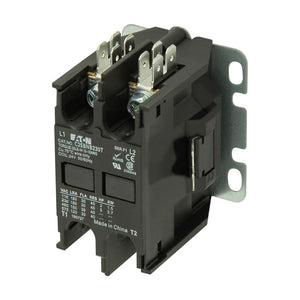 The C25BNB230T, produced by Eaton, is a definite purpose contactor designed for specific applications. It features a quick configuration with a current rating of 30 amperes (A) and operates at 277 volts alternating current (Vac) and 60 Hertz (Hz) frequency. The contactor is an open type with a metal mounting plate, providing durability and stability during operation. Despite its compact size, it offers a two-pole configuration with power terminals utilizing both binding head screw and quick connect mechanisms.