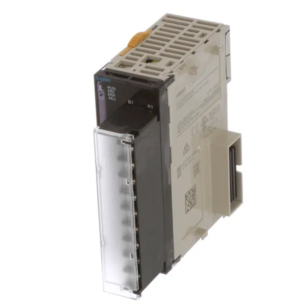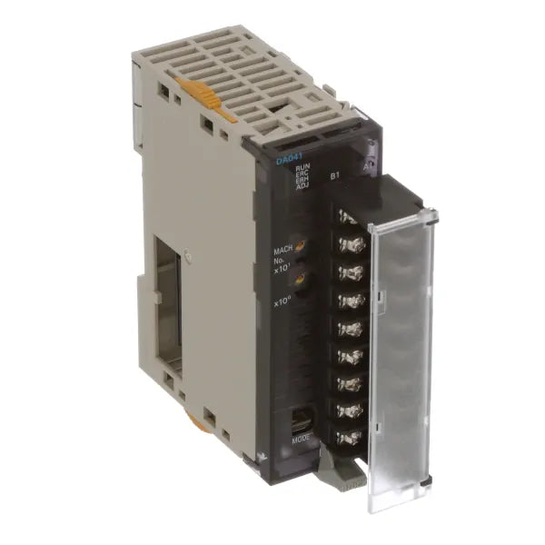 Model Number CJ1W-DA041 is a programmable logic controller (PLC) module. This unit has been designed and manufactured by Omron Automation and Safety. It is developed specifically for applications involving analog output control. Therefore, this PLC unit features four 12-bit analog outputs. In addition to that, this PLC unit can also provide precise manipulation of analog signals. Since it uses a screw terminal connection, it ensures secure and reliable connectivity. Besides that, its compact size and form factor, DIN rail mounting, and compliance with various safety standards render it well-suited for industrial settings. While the module lacks safety functions, it compensates with a detachable I/O connector, simplifying maintenance. Equipped with a screw-type I/O connector, it achieves efficient analog signal processing with a 4000 (ms) per unit conversion time. The CJ1W-DA041 is easy to install and adaptable to diverse industrial environments due to its small design, including DIN rail mounting. Its lightweight (0.331 pounds or 150.14 grams) and compact dimensions (90 millimeters in height, 31 millimeters in width, and 89 millimeters in depth) optimize space usage. The module's compliance with multiple approval organizations, including CE, cULus, Lloyd, and NK, ensures reliability and adherence to pertinent safety regulations. Despite lacking safety functions, its detachable I/O connector streamlines maintenance and replacement decisions. The CJ1W-DA041 hass a screw-type I/O connector for effective analog signal processing and achieves a 4000-millisecond per unit conversion time. However, its design is solely geared towards analog output control, thus omitting linear analog input capabilities and temperature input options.