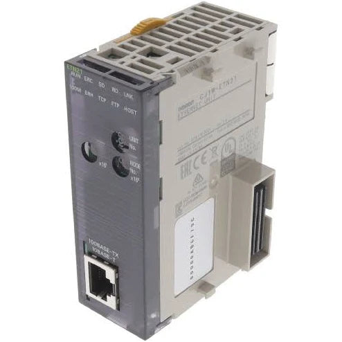 The Communications Module, designated for DIN Rail installation, is an Ethernet unit featuring compatibility with 100Base-TX and 10 Base-T networks. It is equipped with a single RJ45 socket, facilitating network connectivity. The module supports various socket services, including TCP/IP and UDP/IP protocols, enabling seamless communication over networks. Additionally, it incorporates functionalities such as File Transfer Protocol (FTP), Simple Mail Transfer Protocol (SMTP), and Factory Interface Network Service (FINS).