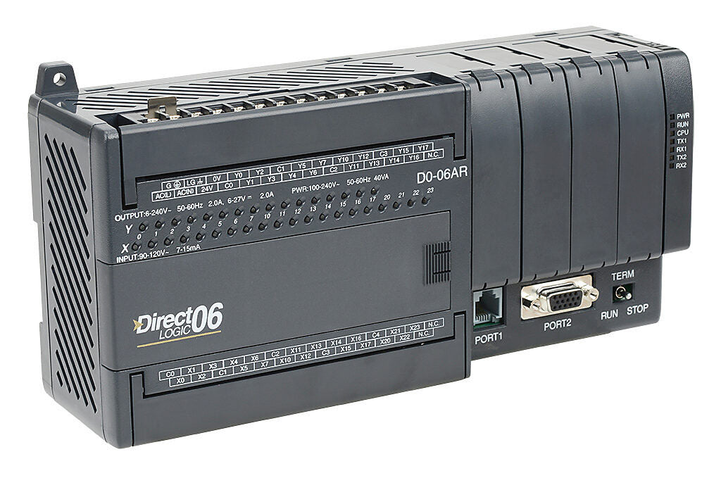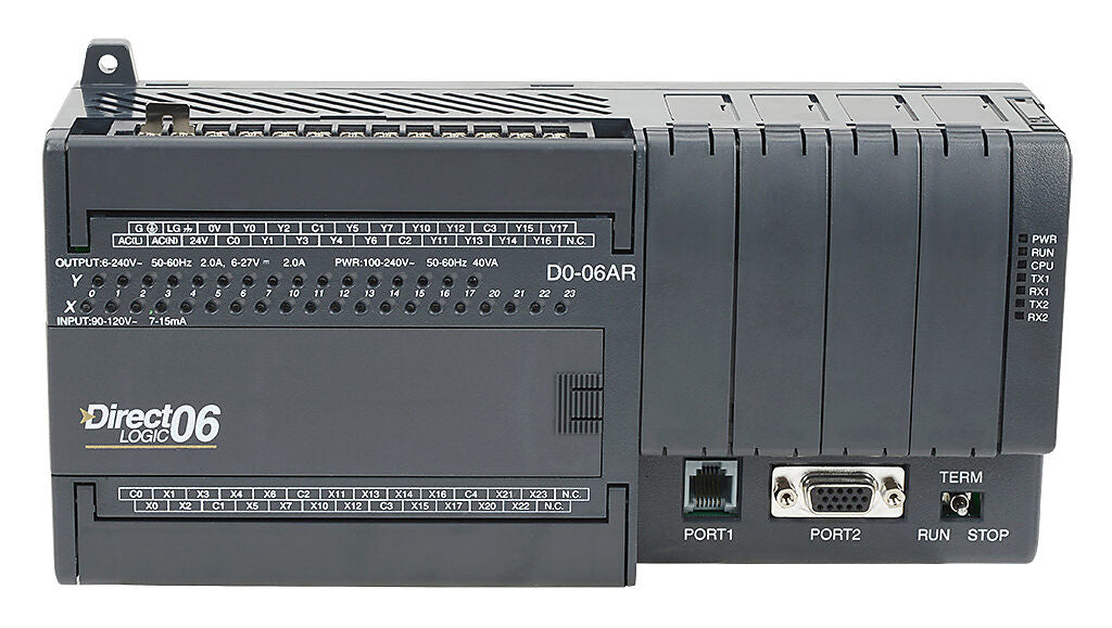 D0-06AR | Automation Direct DirectLOGIC DL06 PLC, 120-240 VAC required, serial ports, Discrete Input: 20-point, AC, Discrete Output: 16-point, relay.