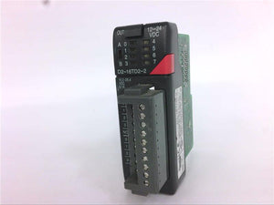 The D2-16TD2-2 output module features 16 discrete output points, each capable of handling a nominal output voltage of 12-24 VDC. This voltage range makes the module suitable for a wide variety of control tasks in industrial settings, where precise and reliable voltage control is required. The discrete output type is sourcing, which means that the module sources current to the load, providing a positive voltage to the connected devices. This sourcing configuration is commonly used in industrial automation for driving various loads such as relays, solenoids, and other actuators.