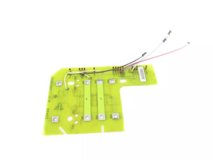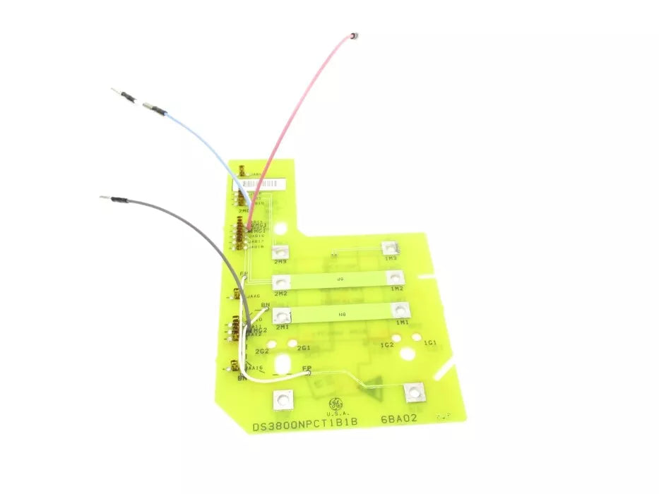 The DS3800NPCT functions as a Field Power board within the Mark IV system. Unlike the standard rectangular boards, the DS3800NPCT has a unique shape resembling a lower-case "b." This design includes a base portion with two parallel lines of drill holes extending from the top to the bottom edge. These holes, numbering fifteen in total, are individually labeled and typically ringed with conductive material to facilitate connections. Additionally, the leading edge of the board features two slots, one straight and one slanting, which aid in its installation and functionality within the system.