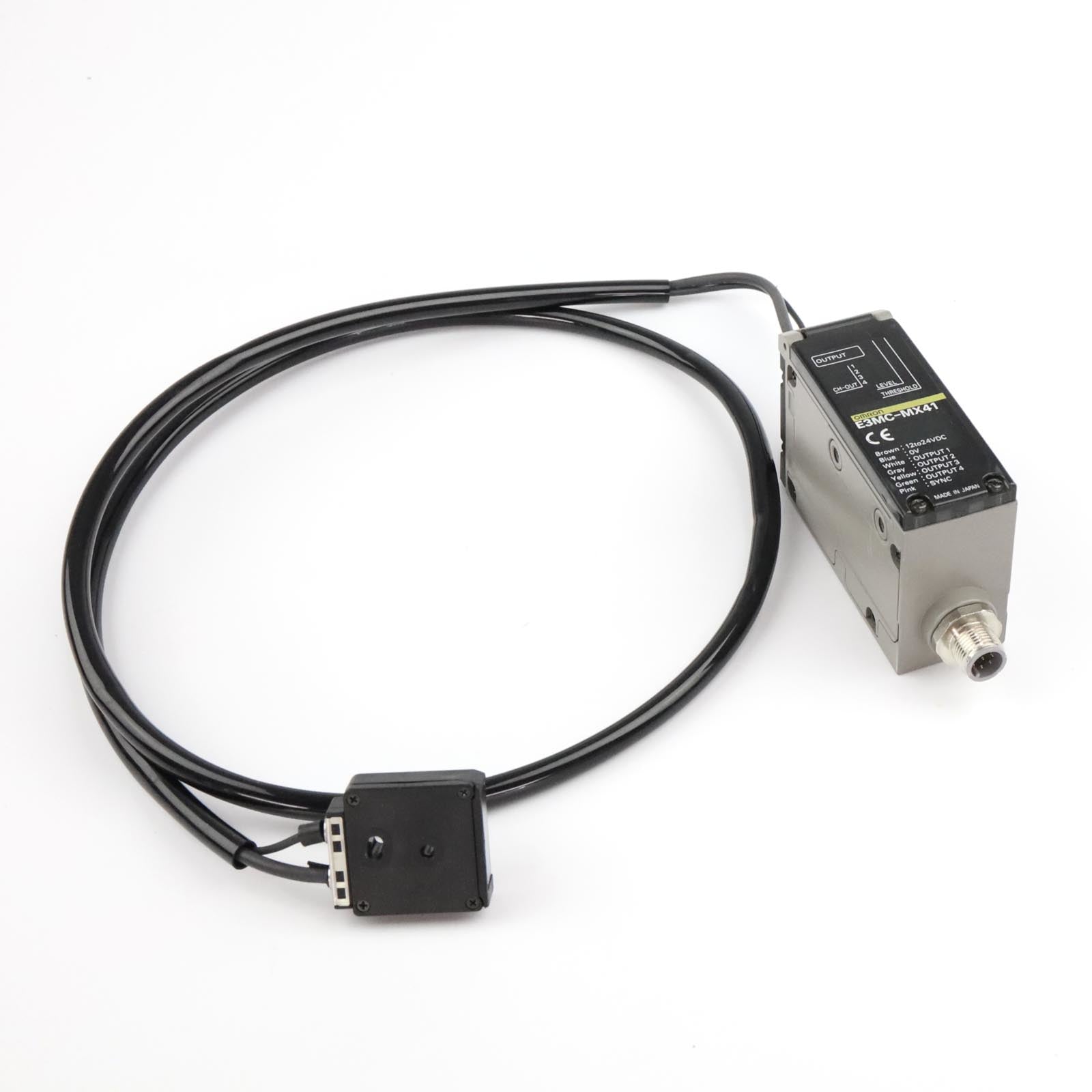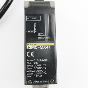 The Omron E3MC-MX41 is a fiber optic photoelectric sensor with four output channels, designed for precise object detection in automation systems. Operating on 12–24 VDC, it features a PNP output configuration and M12 connector for secure installation.