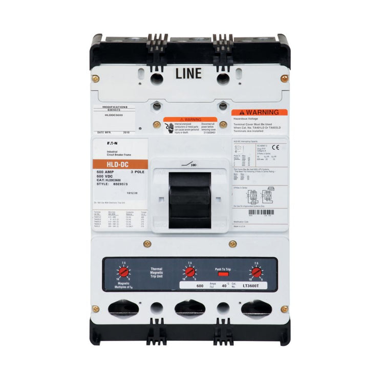 The HLDDC3600F is a molded case circuit breaker frame from Eaton’s PV Guard series, specifically developed for photovoltaic and DC power systems. Built on the L-frame platform, it provides a 600 A capacity and supports both 600 Vac and 600 Vdc applications, making it suitable for renewable energy installations. This unit is supplied as a frame-only configuration with line and load terminals, allowing integration with appropriate trip units and accessories. Designed to meet UL 489 standards, it delivers dependable protection in solar arrays, combiner boxes, and industrial DC distribution systems.