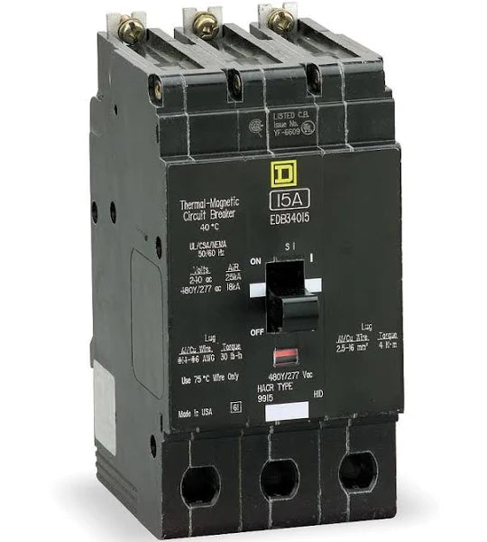 The breaker features aluminum lugs with a terminal lug rating ranging from AWG 12 to AWG 2/0 for aluminum and AWG 14 to AWG 2/0 for copper. Its breaking capacity has been extensively tested, with capacities of 18 kA at 480Y/277 VAC and 25 kA at 120/240 VAC.