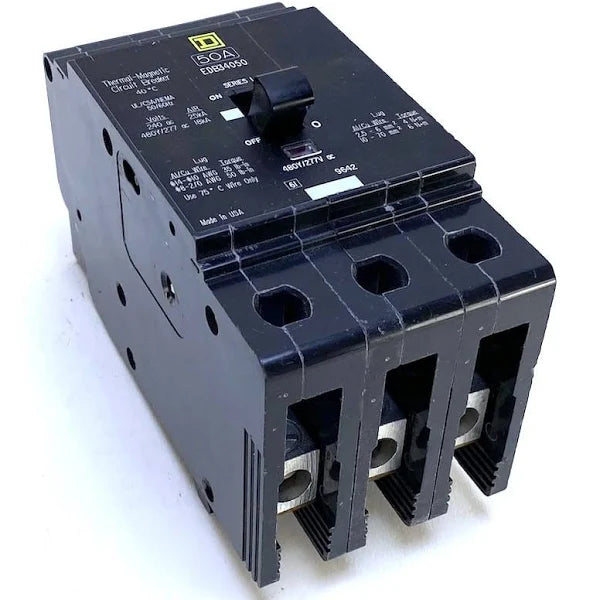 The Mini circuit breaker, E-Frame, rated at 50A and featuring 3 poles, is primarily designed for use in Lighting Panelboard circuits, specifically optimized for Square D NF Panelboards. This bolt-on breaker operates at a system voltage of 480Y/277 VAC and boasts a maximum interrupting capacity of 25 kA.