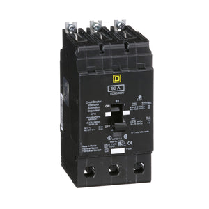 EDB34090, Schneider Electric circuit breaker molded case EDB Series, type EDB, 3PH, 3P, 480V, 90A, 18kA@480V, Bolt-On, complete with LI - Long-Time and Instantaneous trip functions, Thermal Magnetic.