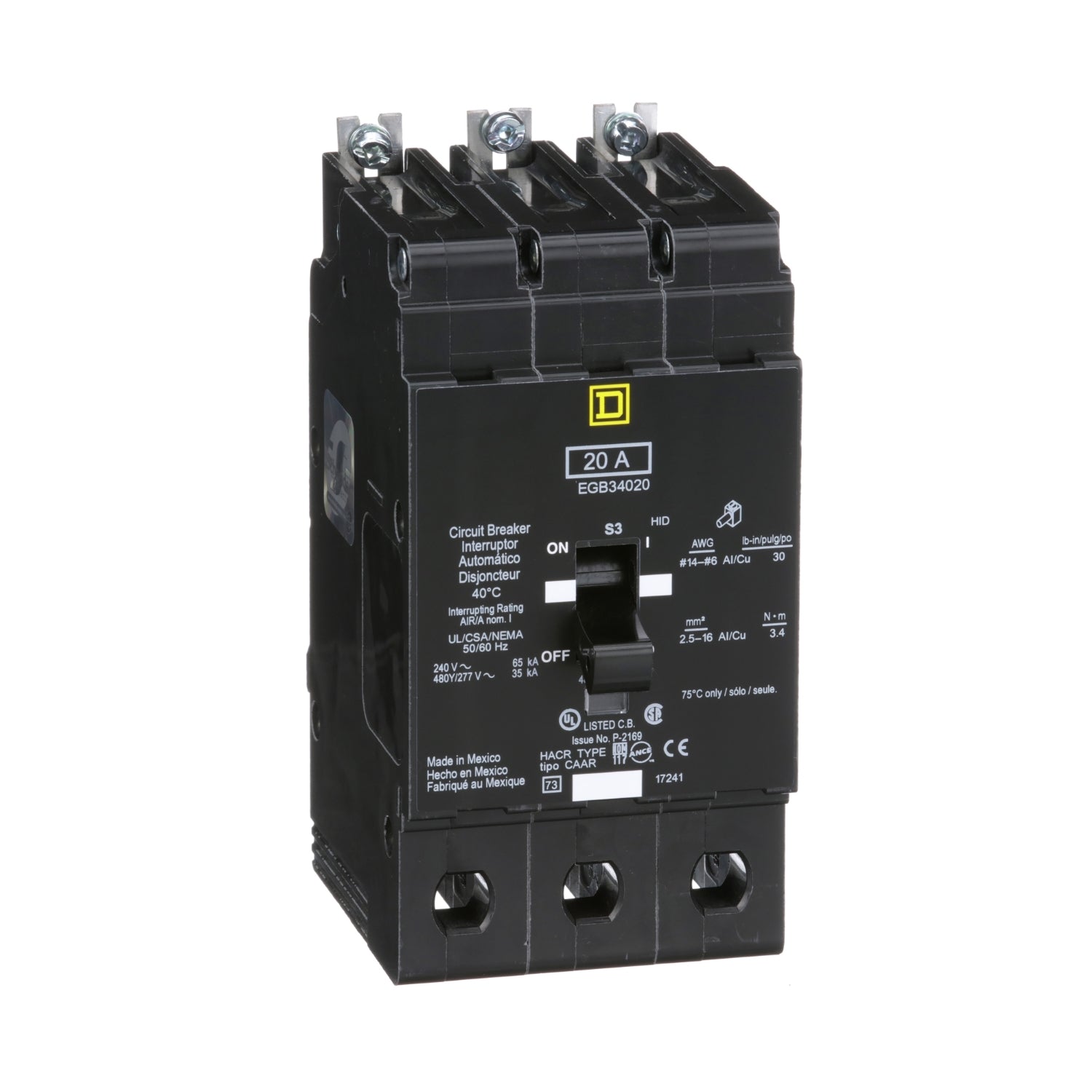 EGB34020, Square D,Schneider Electric, EGB Series, type EGB, 3P, 3PH, 20A, 277/480V, 35kA@480V, high interrupting capacity, 40°C, Bolt-On, Thermal Magnetic, molded case circuit breakers.