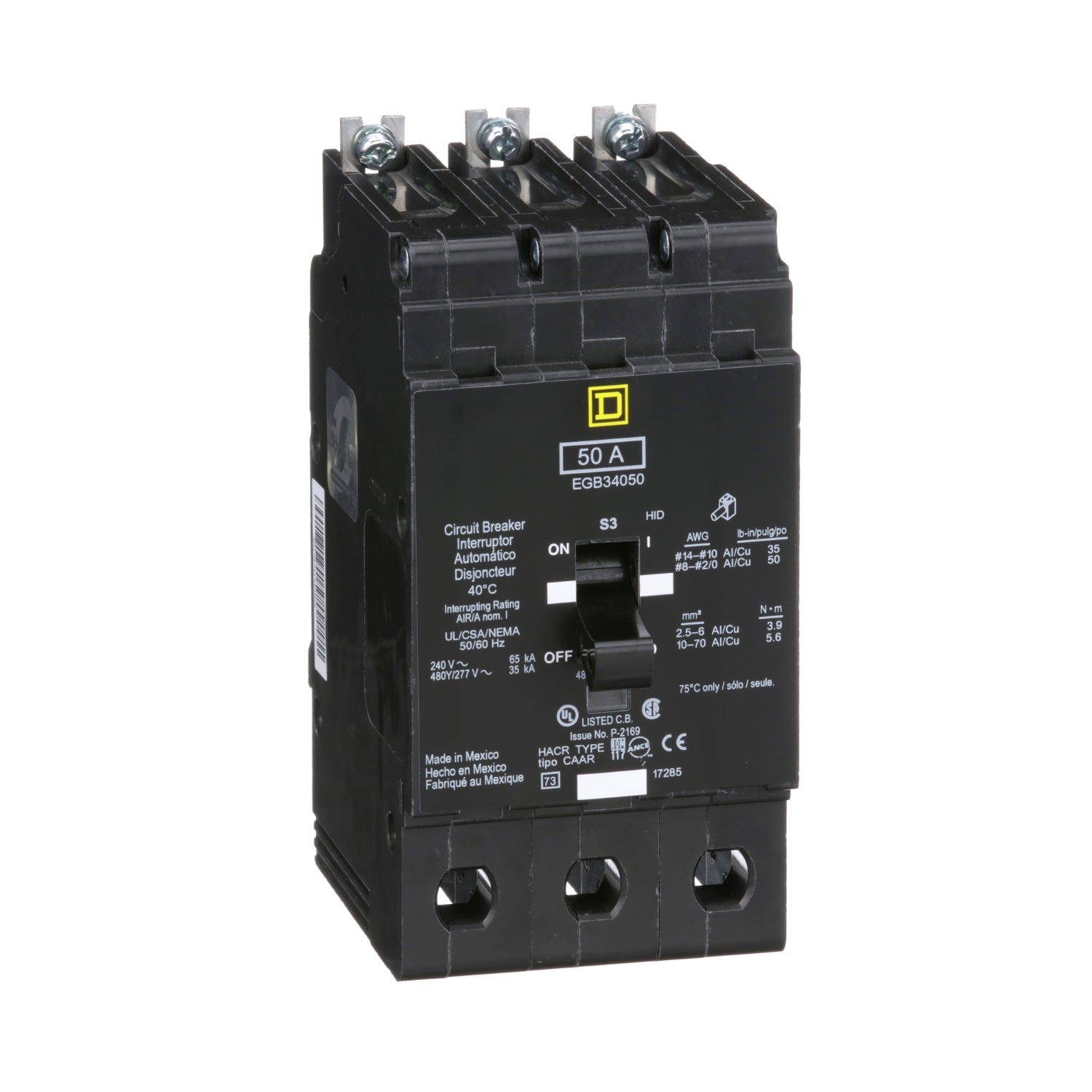 Rated at 50A for a three-pole configuration, the EGB34050 operates at an operational voltage of 480Y/277 VAC. It boasts a maximum interrupt rating of 65 kA at 120 VAC, making it suitable for demanding industrial and commercial applications. The breaker has a hold current of 630A, which defines the maximum current it can sustain without tripping, and a trip current of 1800A, the threshold at which the breaker is guaranteed to trip.