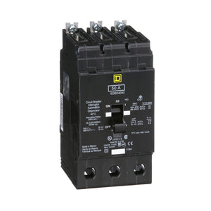 The EGB34050 is a 50A, 3-pole mini circuit breaker from the E-Frame series, designed for use in Square D NF panelboards. Engineered for lighting panelboard applications, E-Frame breakers provide robust features including thermal-magnetic trip units and trip indicators to signal circuit interruptions. This breaker is rated for HACR and HID applications, with an operational voltage of 480Y/277 VAC. It offers a maximum interrupt rating of 65 kA at 120 VAC, and features a hold current of 630A and a trip current of 1800A.
