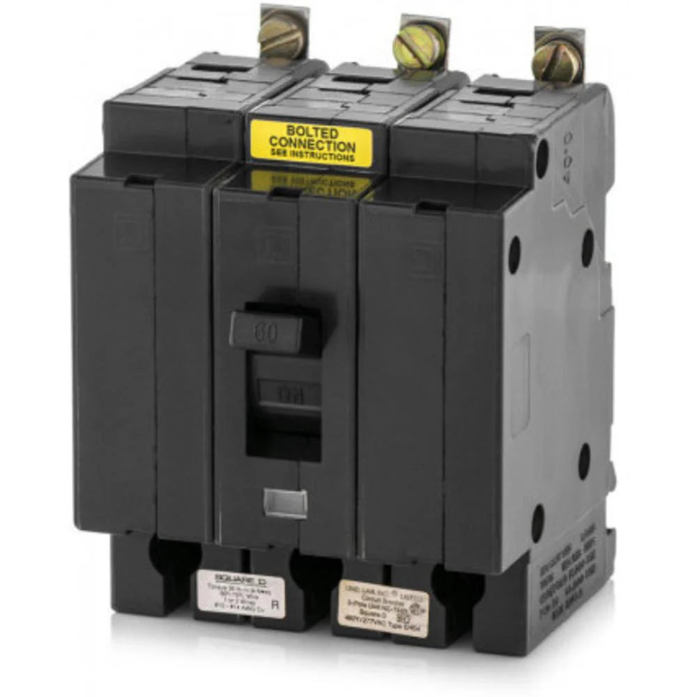 The EHB34060 from Schneider Electric is a robust molded case circuit breaker designed to ensure reliable protection in industrial and commercial settings. Part of the EHB series, it features three poles, an amperage rating of 60A, and operates at 480 volts with a three-phase configuration. Its bolt-on connection mechanism ensures secure installation.