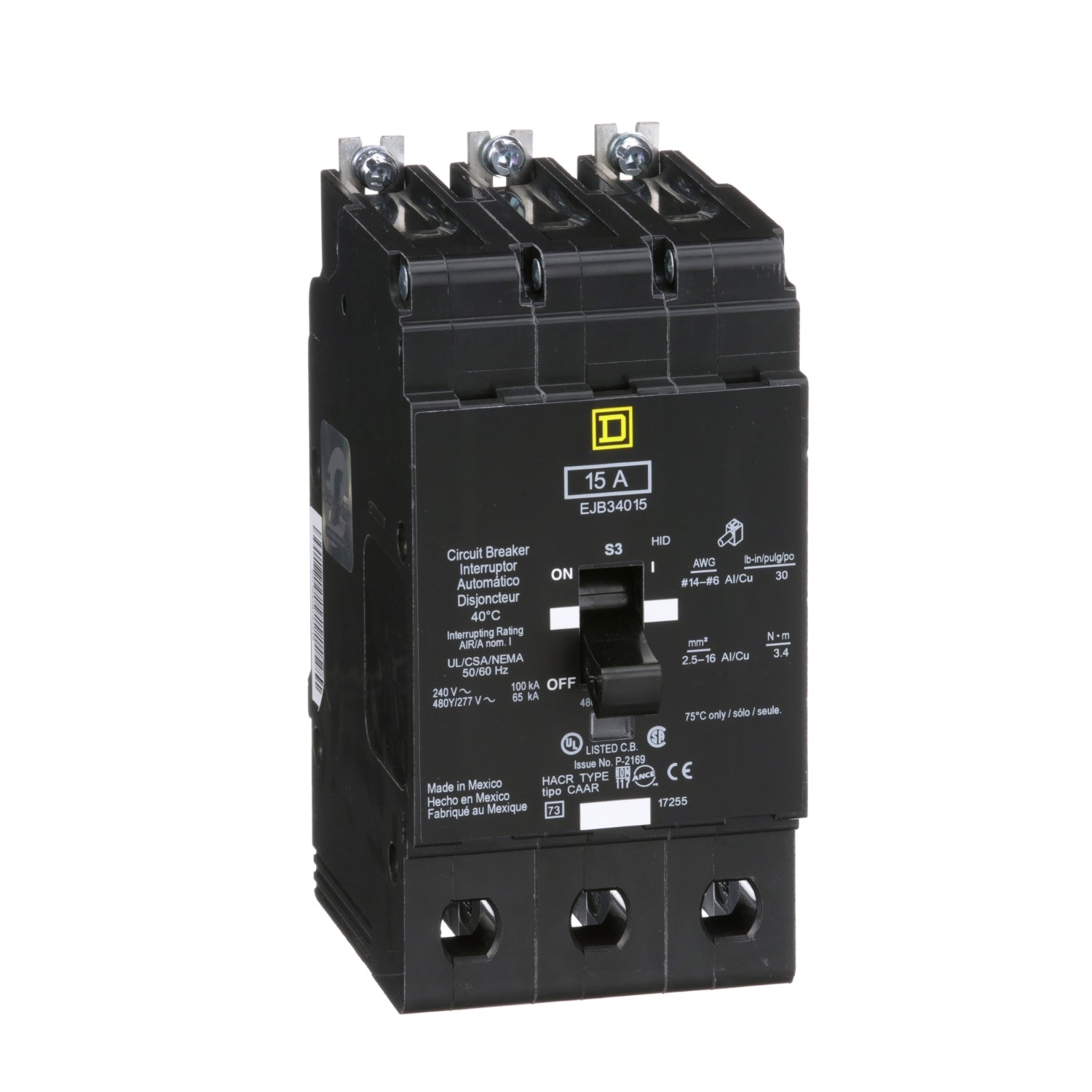 EJB34015, Square D,Schneider Electric, EJB Series, type EJB, 3P, 3PH, 15A, 277/480V, 65kA@480V, extra high interrupting capacity, 40°C, Bolt-On, Thermal Magnetic, molded case circuit breakers.