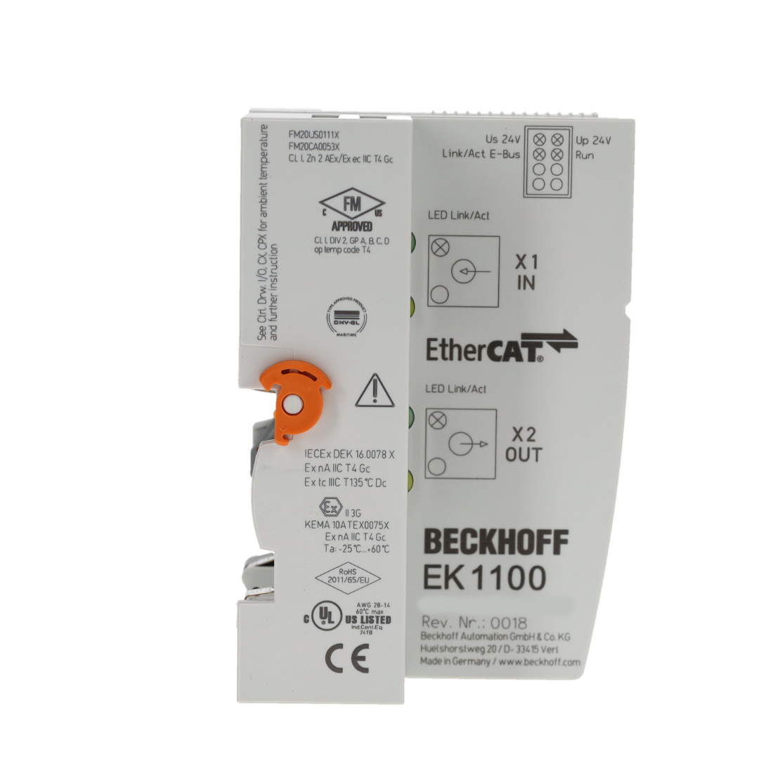 The Beckhoff EK1100 is a standard EtherCAT Coupler designed to connect EtherCAT Terminals (EL terminals) to an EtherCAT network. It establishes communication between the EtherCAT controller and connected I/O modules, ensuring fast and deterministic data exchange.