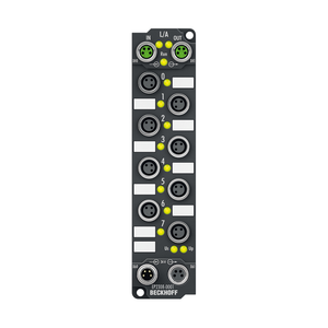 The EP2308-0001 is part of Beckhoff’s EtherCAT Box series, engineered for distributed I/O applications in harsh industrial environments. It provides four digital inputs and four digital outputs, allowing efficient signal processing close to the sensors and actuators. Inputs feature a 3 ms filter for signal stability, while outputs handle load currents up to 0.5 A with individual short-circuit and reverse polarity protection. The module supports 24 V DC operation and includes internal power distribution with up to 0.5 A available for connected sensors. Its M8 connectors and IP67 protection enable reliable, tool-free field installation. The integrated EtherCAT interface ensures high-speed, deterministic communication and synchronization within networked control architectures.