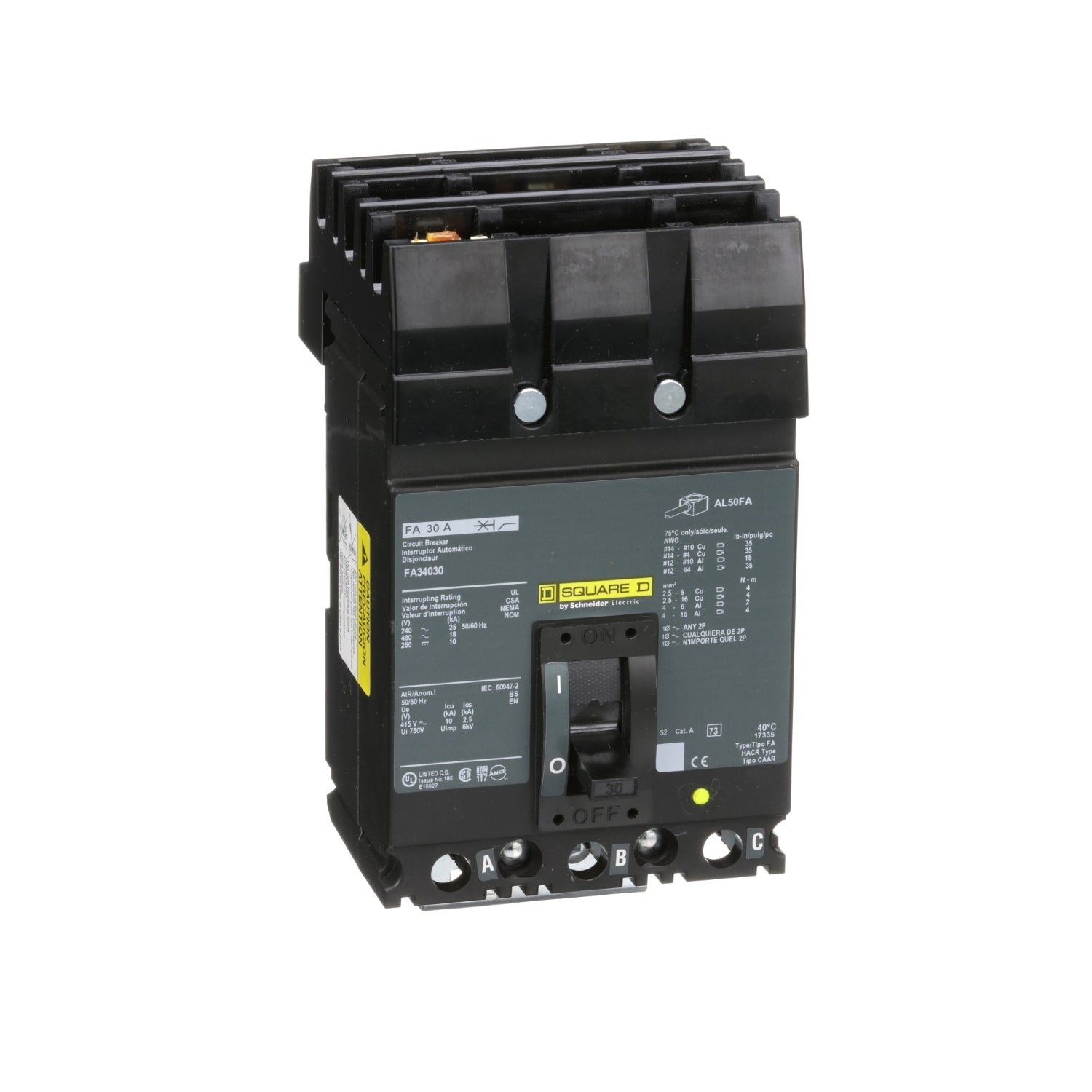 The FA34030 by Schneider Electric is a molded case circuit breaker with a 30 ampere rating, designed for industrial electrical protection.
