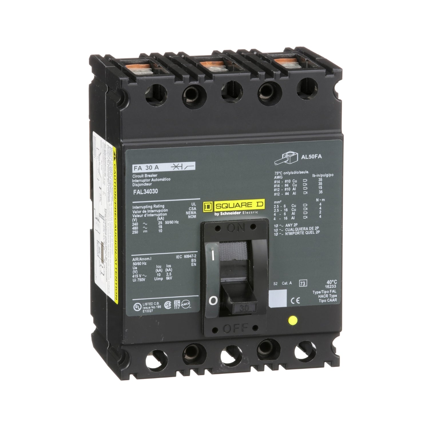 FAL34030, Square D, FAL Series, type FAL, 3P, 3PH, 30A, 480V, 18kA@480V, standard interrupting capacity, Feed-Thru, complete with LI - Long-Time and Instantaneous trip functions and line & load side lug terminals, Thermal Magnetic molded case circuit breakers.
