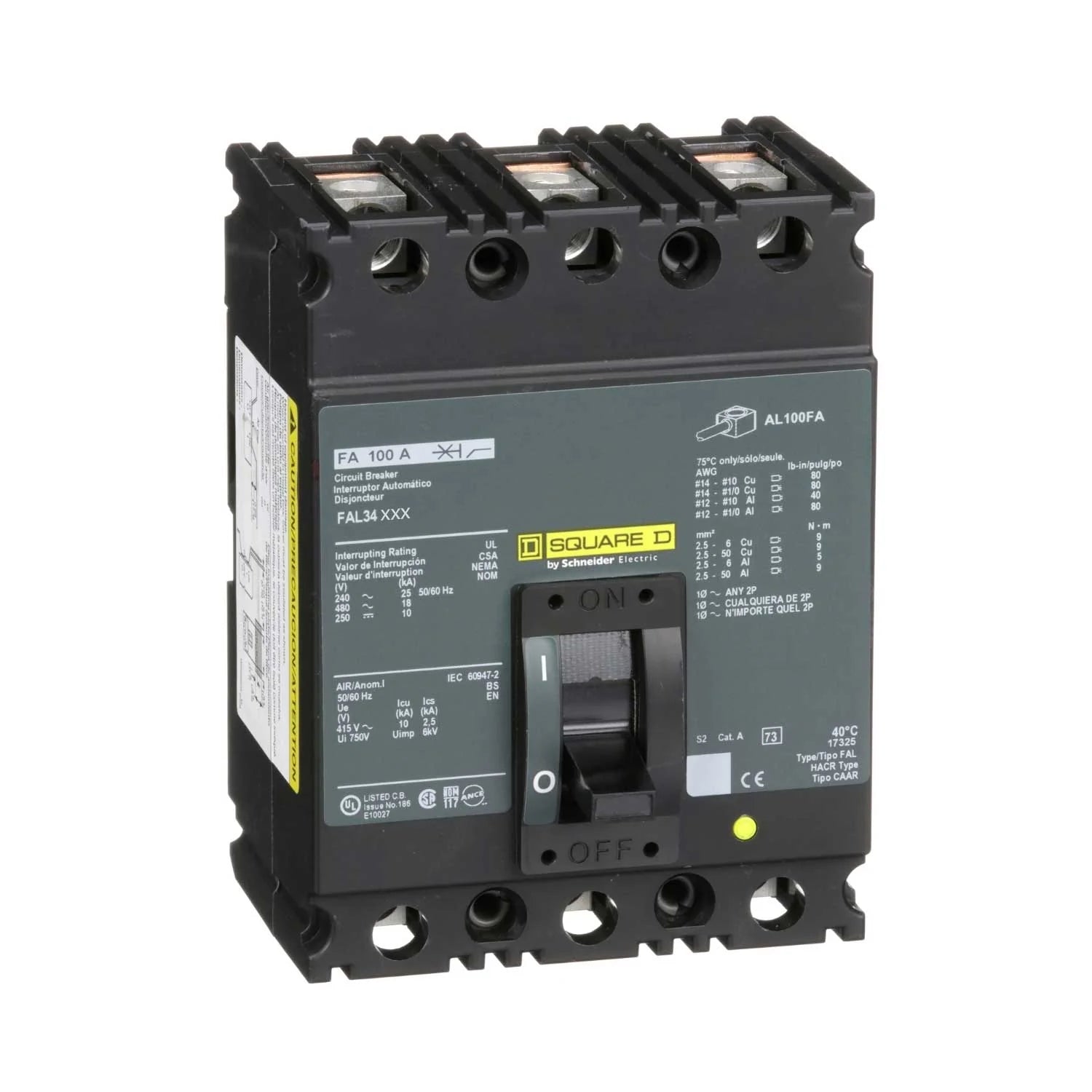 The FAL34070 is a circuit breaker manufactured by Square D, belonging to the FAL Series. It is designated as type FAL and features a three-pole configuration. Operating at 70 amperes (70A) and 480 volts (480V), it is designed to provide electrical protection in various applications.