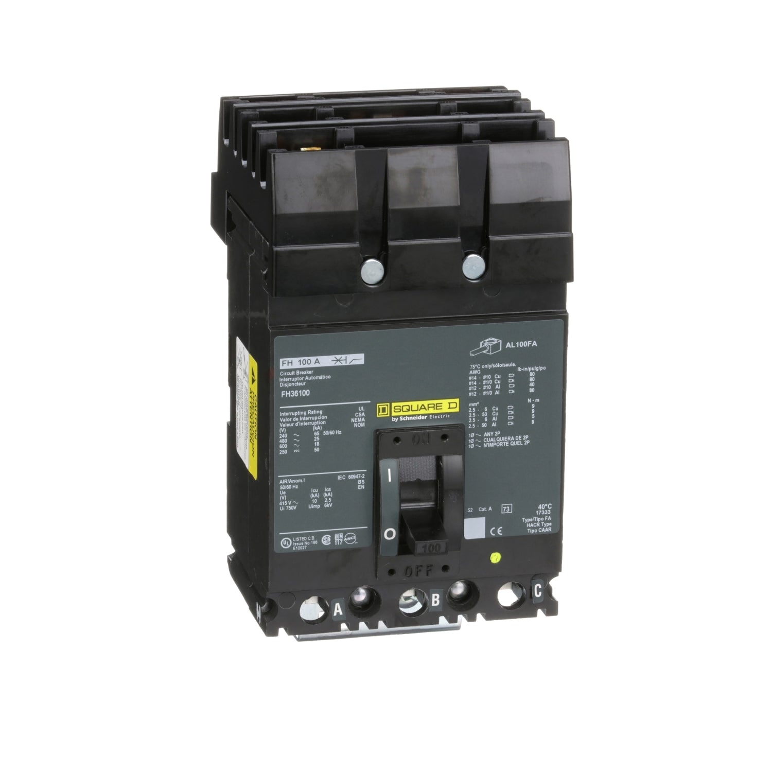 FH36100, Square D, I-Line, type FH, 3P, 3PH, 100A, 600V, 25kA@480V, high interrupting rating, 40°C, I-Line Style Plug-In, Thermal Magnetic, molded case circuit breakers.