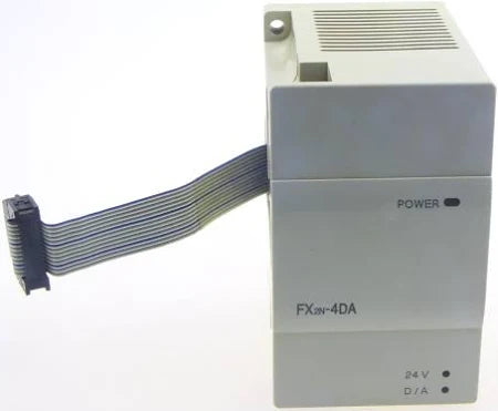 The Mitsubishi FX2N-4DA MELSEC-F Analog Output Block is a specialized function block designed for integration with Mitsubishi MELSEC-F programmable controllers. It facilitates analog output by converting digital values into voltage or current signals. Featuring 4 output channels, each channel can be individually configured to output either voltage signals ranging from -10 to 10 Volts or current signals ranging from 4 to 20 milliamps (mA) or 0 to 20 mA.
