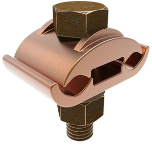 The Burndy GC2929 Mechanical Grounding Connector is a high copper alloy connector designed for securely joining two parallel cables to a 1/4" thick bar. It features silicon bronze hardware for durability and corrosion resistance, making it suitable for direct burial in earth or concrete.