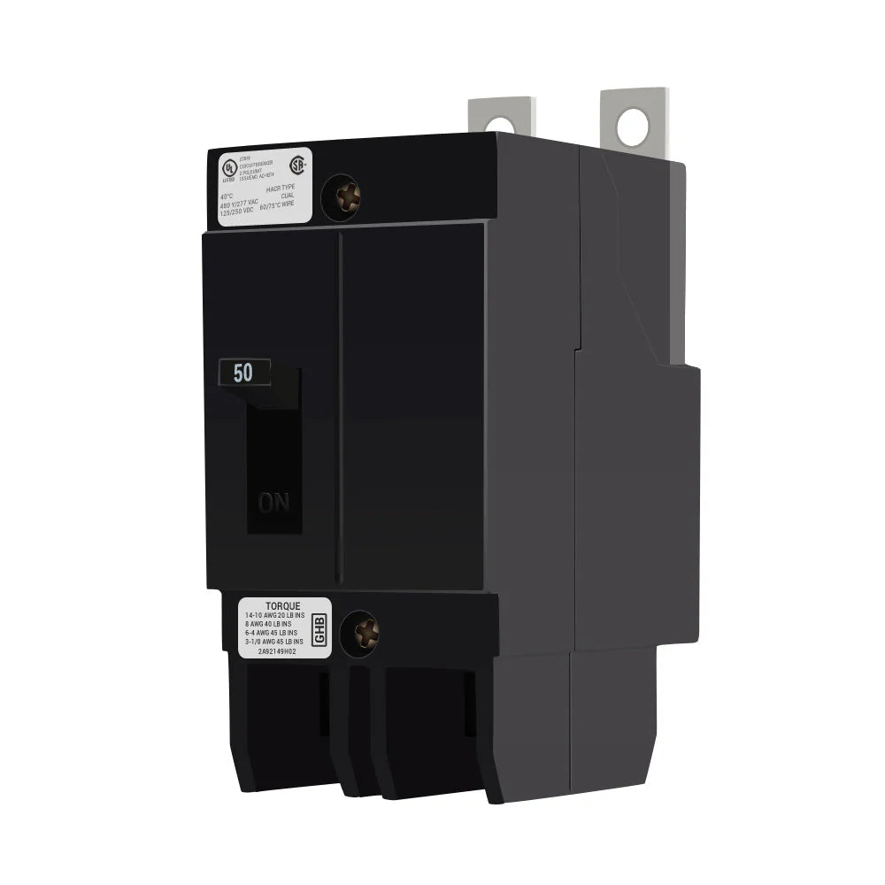 The GHB2050's compatibility with two poles makes it suitable for protecting two-phase electrical systems. Its 50 A current rating allows it to handle moderate power loads effectively. The voltage ratings of 480Y/277 Vac and 125/250 Vdc enable versatile application across different voltage systems.