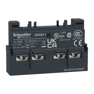 The GVAE11 is a TeSys Deca Manual Starter and Protector, serving as an auxiliary contact block designed for motor circuit breakers GV2 and GV3. It is equipped with 1 normally open (NO) and 1 normally closed (NC) instantaneous auxiliary contacts, facilitating versatile control options.