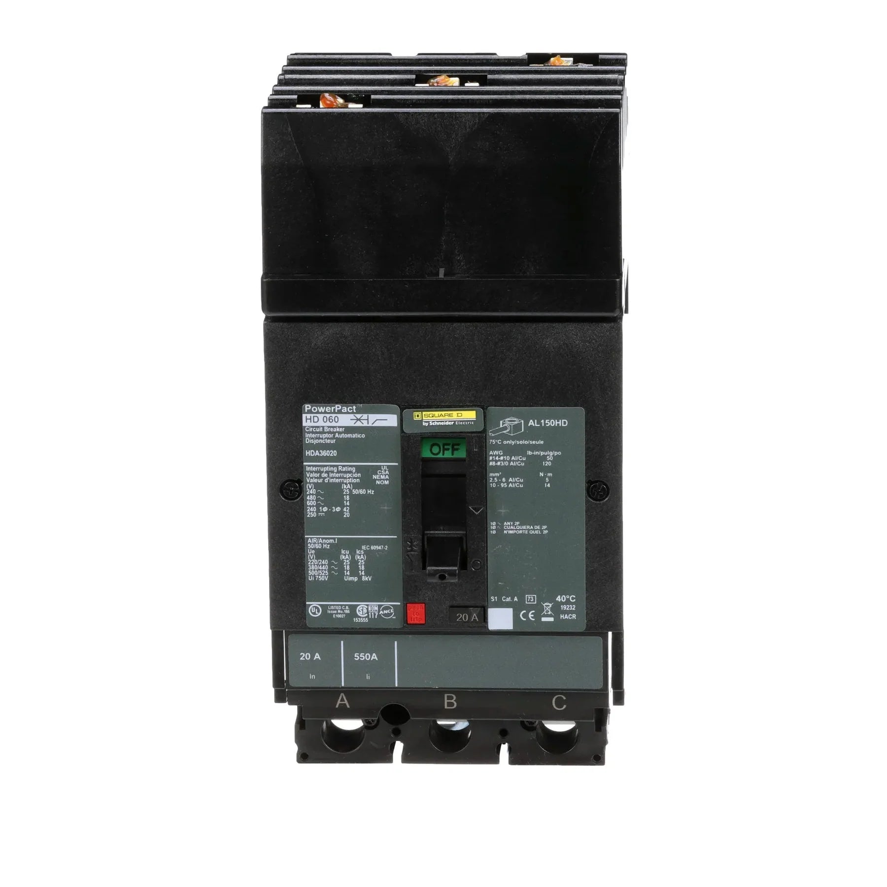 The Schneider Electric HDA36020 is a high-quality molded case circuit breaker belonging to the Powerpact family. Engineered for robust performance, this breaker operates at a voltage of 600V and is rated for 20 amperes, making it ideal for three-phase applications in industrial settings.
