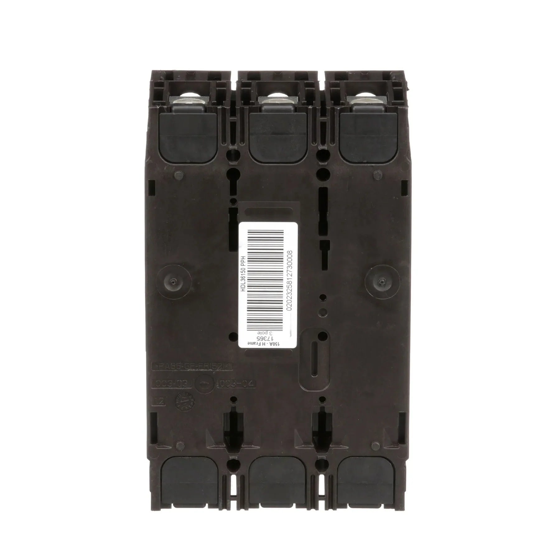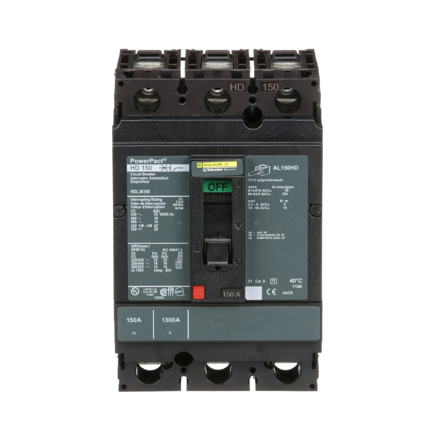 The HDL36150 is a 3-pole circuit breaker from the PowerPact H series by Schneider Electric, designed to protect electrical systems against overloads and short circuits. It features thermal magnetic trip technology with a breaking capacity of 14,000 amps (14kA) at 600VAC, ensuring effective protection under fault conditions.