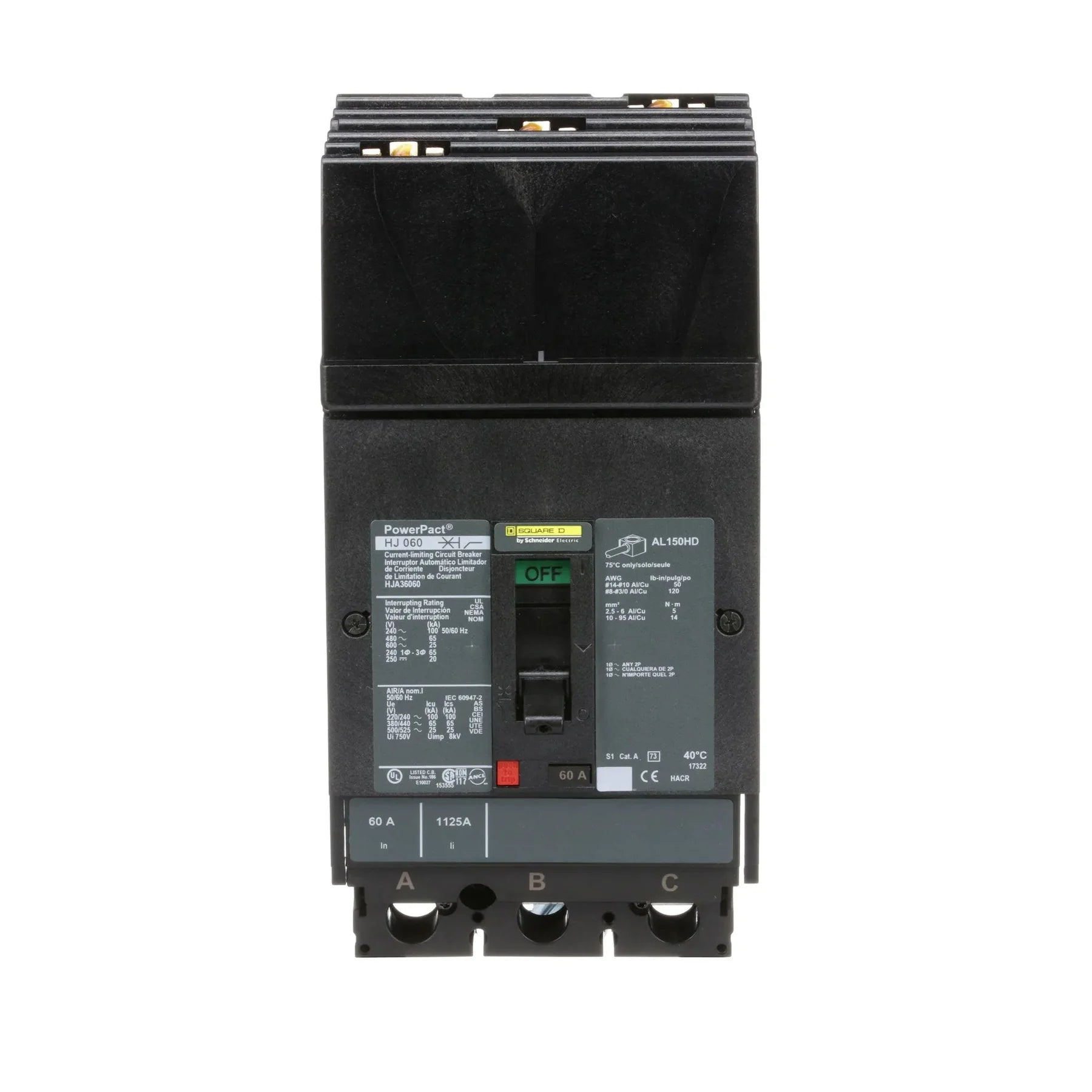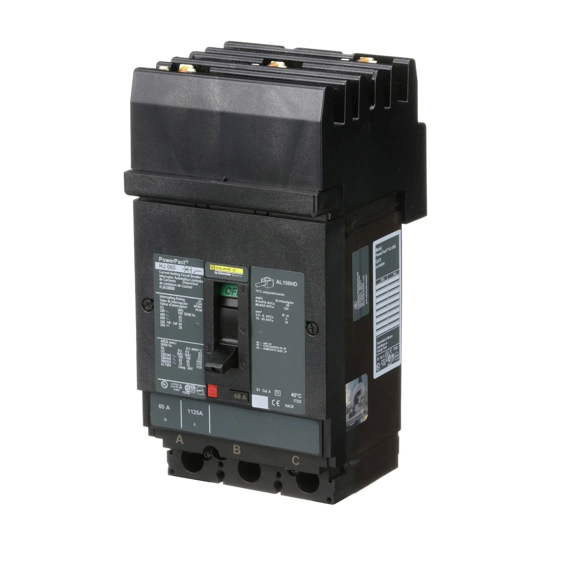 The HJA36060 is a 60A, 3-pole circuit breaker from Eaton's PowerPacT H series, designed to protect electrical systems operating at 600VAC from overloads and short circuits. It utilizes thermal magnetic circuit protection with a robust breaking capacity of 25kA at 600VAC, ensuring reliable performance under fault conditions.