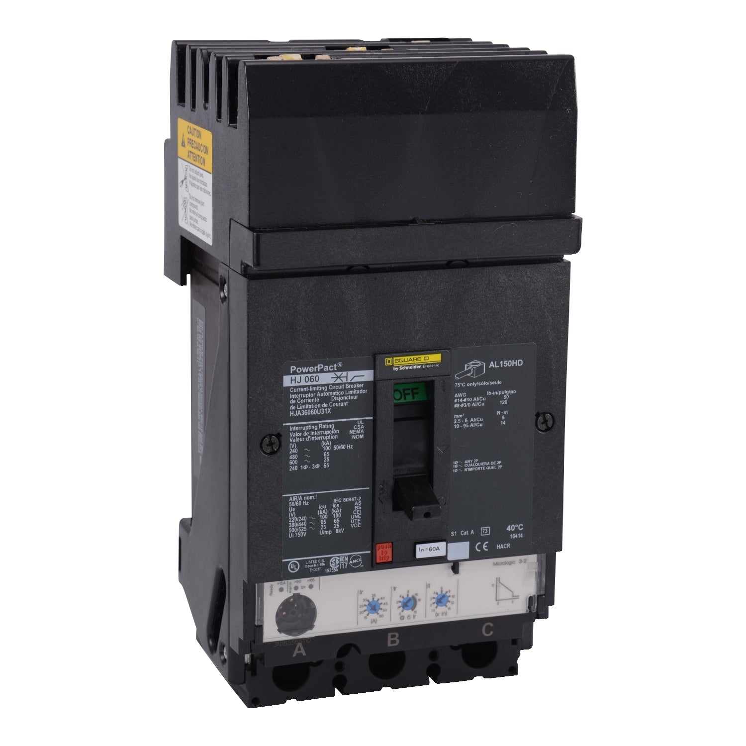 With a temperature rating up to 104 degrees Fahrenheit (40 degrees Celsius), the HJA36060U31X features electronic LI and thermal magnetic trip types, protecting against overload and short circuit conditions. It accommodates wire sizes from 14 to 3/0 AWG aluminum/copper and operates at a voltage rating of 600 VAC.