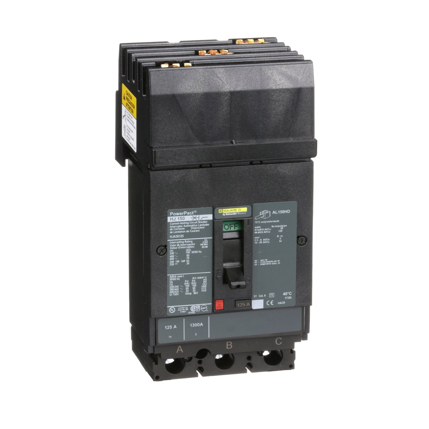 The HJA36125 is a circuit breaker belonging to the PowerPacT H series, designed to safeguard electrical systems against damage due to overloads and short circuits. It is a 125A, 3-pole breaker with a voltage rating of 600VAC and a breaking capacity of 25kA. Equipped with thermal magnetic circuit protection, it ensures reliable operation under varying load conditions.